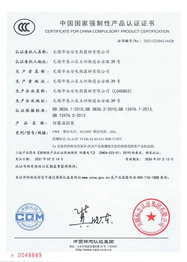CCC证书-防爆温控器
